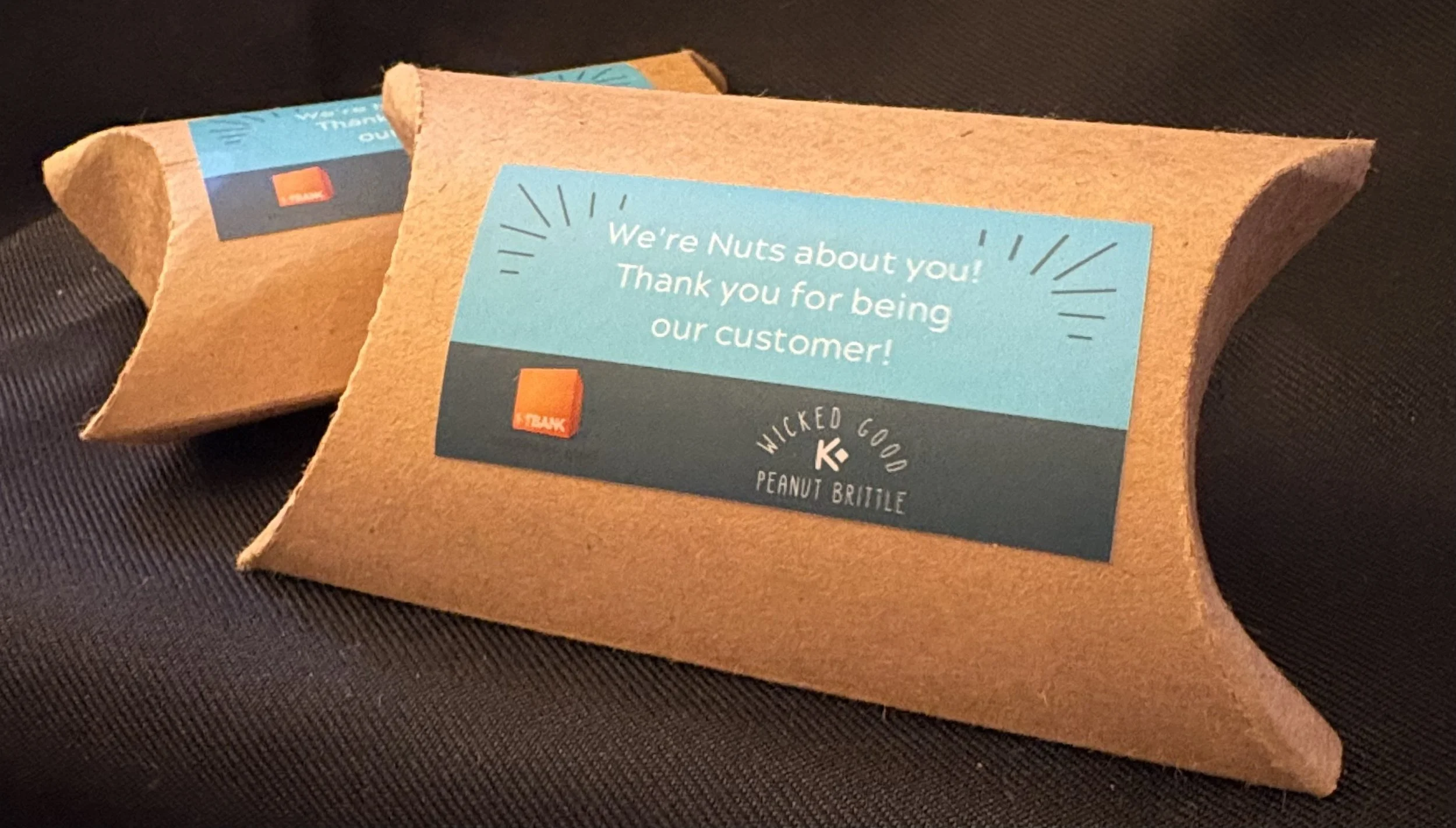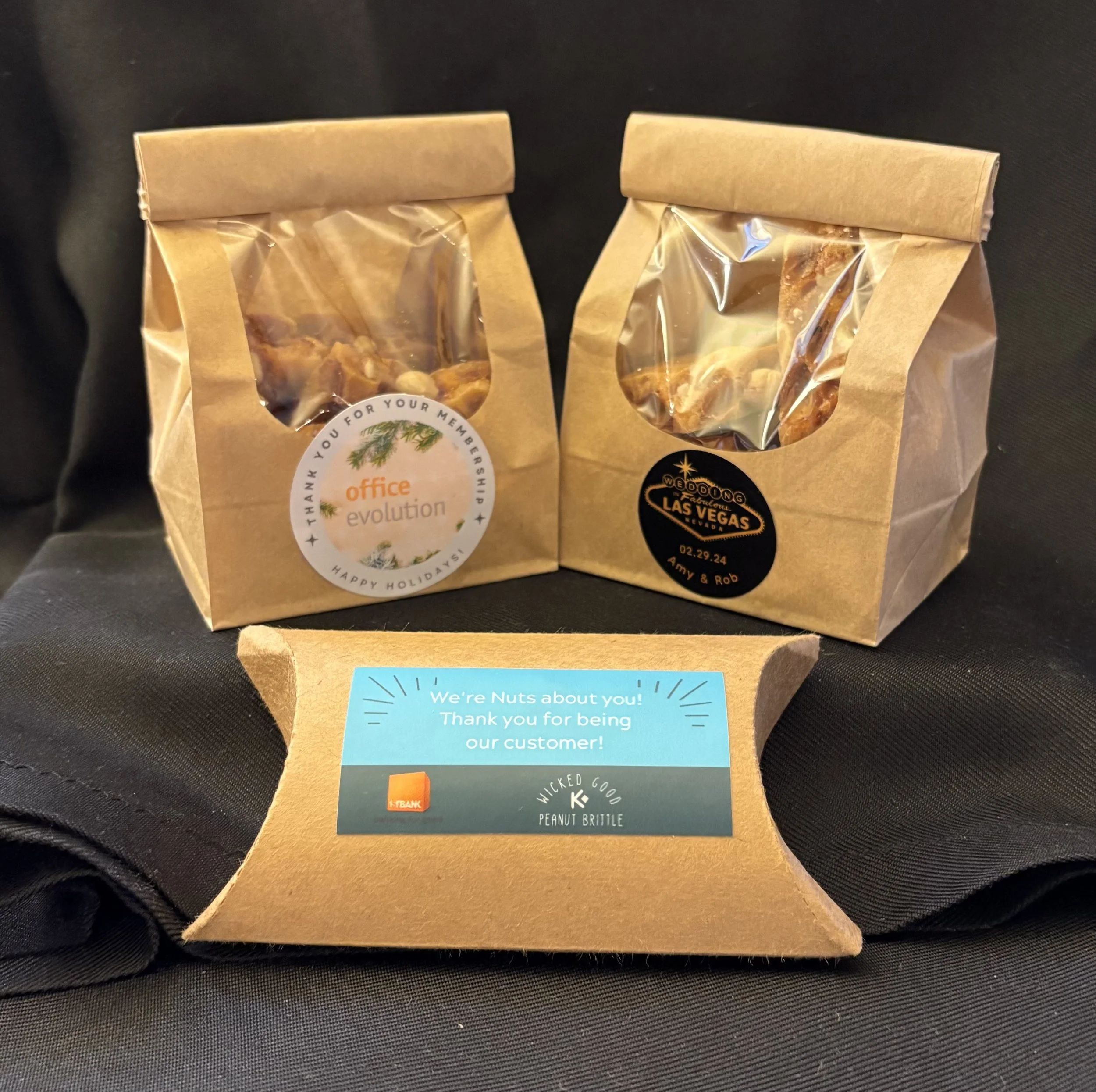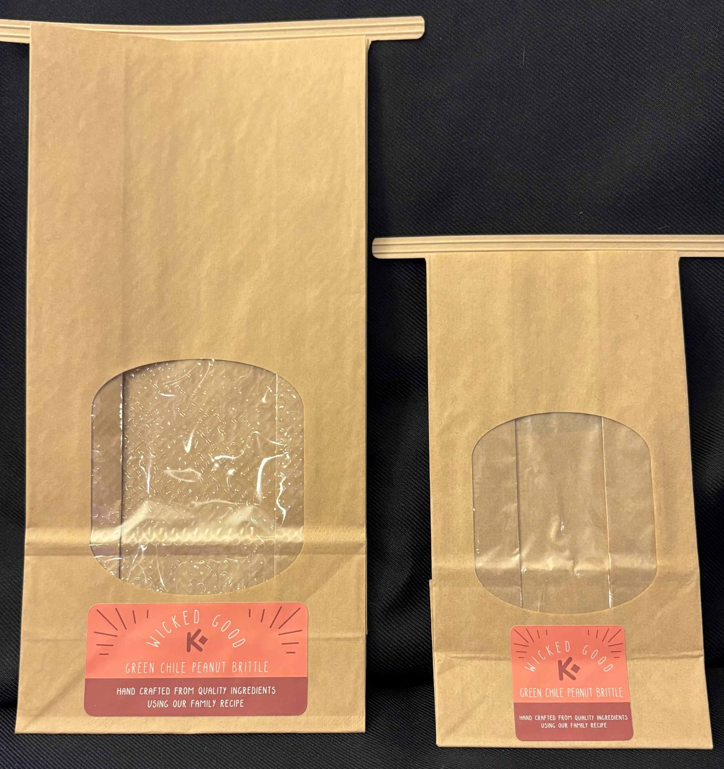 We take our small bags and fill them with 3.5 - 4 ounces of your favorite Wicked Good Peanut Brittle flavor. $9 each - volume discounts available.